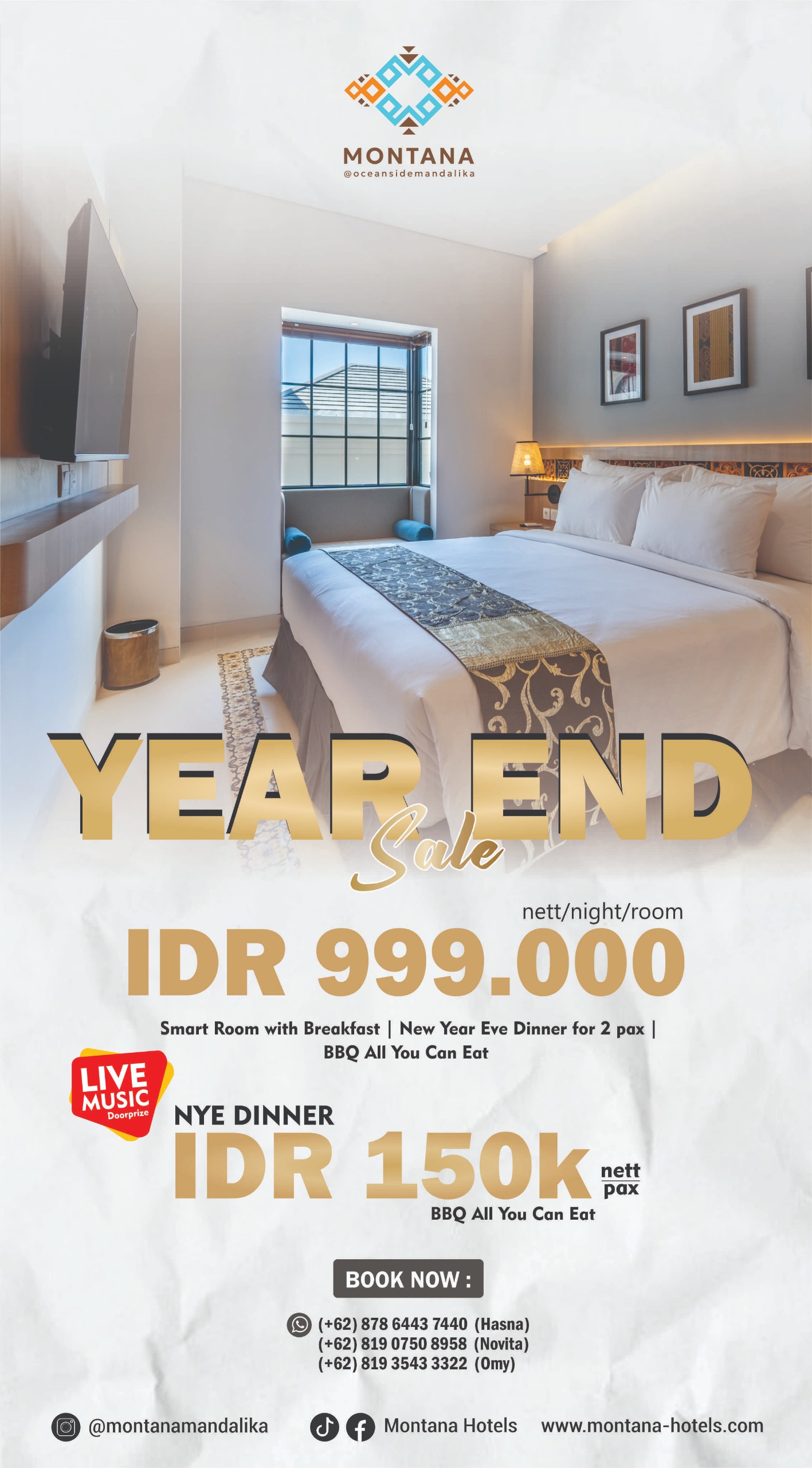 Year End Sale nett/night/room IDR 999.000Smart Room with Breakfast | New Year Eve Dinner for 2 pax | BBQ All You Can EatLIVE MUSIC & DoorprizeNYE DINNER IDR 150K nett/pax: BBQ All You Can BOOK NOW:(+62) 878 6443 7440 (Hasna)(+62) 819 0750 8958 (Novita)(+62) 819 3543 3322 (Omy)www.montana-hotels.com