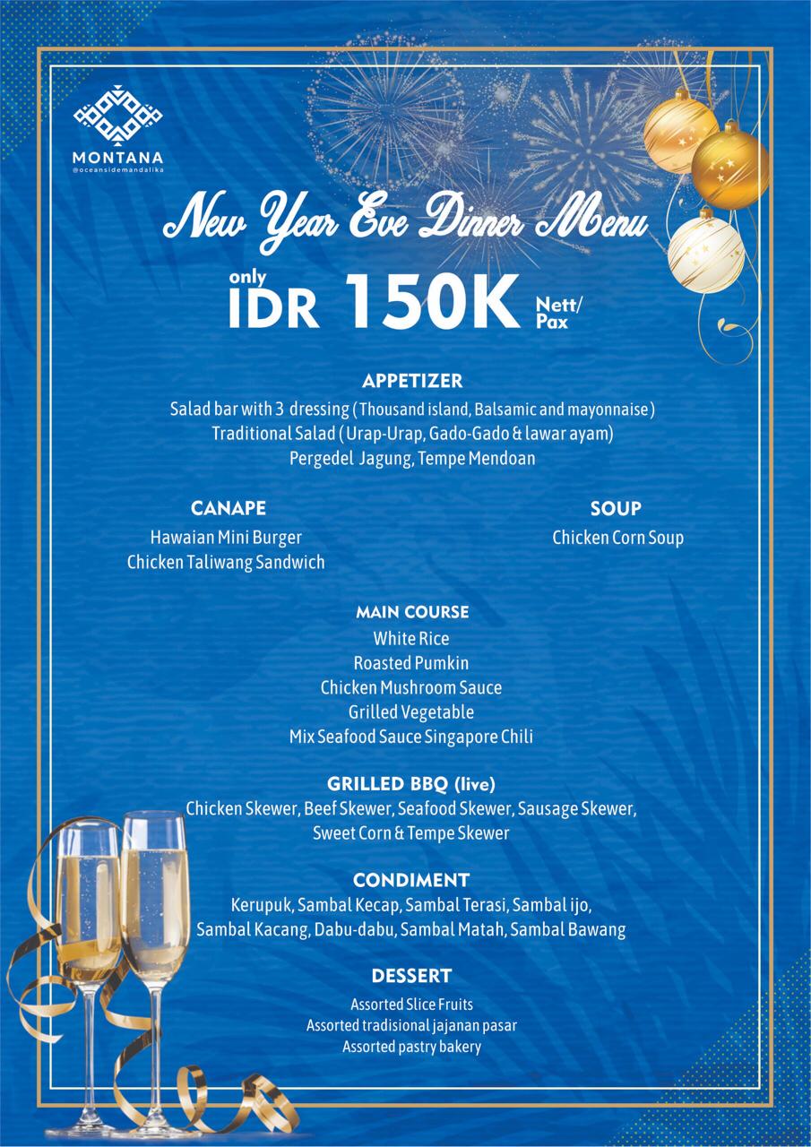 New Year Eve Dinner Menu only IDR 150K Nett/ Pax APPETIZERSalad bar with 3 dressing (Thousand island, Balsamic and mayonnaise) Traditional Salad (Urap-Urap, Gado-Gado & lawar ayam) Pergedel Jagung, Tempe Mendoan CANAPEHawaian Mini Burger & Chicken Taliwang Sandwich SOUPChicken Corn Soup MAIN COURSEWhite Rice, Roasted Pumkin, Chicken Mushroom Sauce, Grilled Vegetable, Mix Seafood Sauce Singapore Chili GRILLED BBQ (live)Chicken Skewer, Beef Skewer, Seafood Skewer, Sausage Skewer, Sweet Corn & Tempe Skewer CONDIMENTKerupuk, Sambal Kecap, Sambal Terasi, Sambal ijo, Sambal Kacang, Dabu-dabu, Sambal Matah, Sambal Bawang DESSERTAssorted Slice Fruits, Assorted tradisional jajanan pasar, Assorted pastry bakery